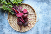 Świeże buraki z liśćmi na niebieskim tle. Zdrowe jedzenie. Widok góry. Wolne miejsce na tekst.