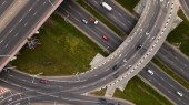 Widok z lotu ptaka na ruchliwe skrzyżowanie w Pradze, Czechach z ruchem ulicznym i wieloma pasami ruchu w ciągu dnia na przedmieściach. Samochody przejeżdżają przez skomplikowane skrzyżowanie z wieloma pasami ruchu i sygnałami.