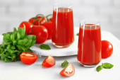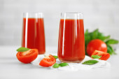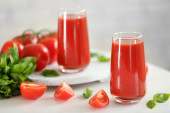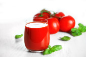 sok z pomidorów i świeżych pomidorów na drewniany stół szczegół