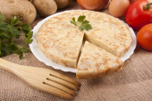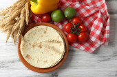 stos domowe pszennej mąki tortilli i warzyw na talerzu, na tle drewniany stół
