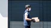 Dostawca w czarnej masce niesie duże zamówienie do tętniącego życiem biurowca w dzień.