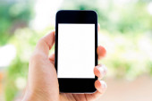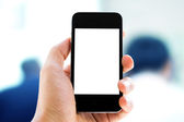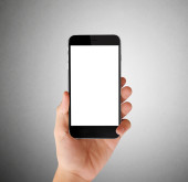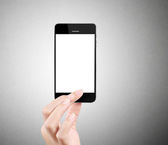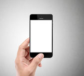 Zbliżenie ręki trzymającej inteligentny telefon na białym tle