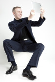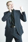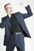 portret biznesmen kaukaski stylowy niebieski garnitur mówiąc