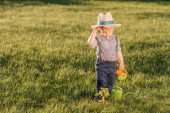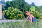 ładny zabawny mały chłopiec biegną do łapać motyle