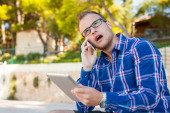 Zdjęcie "turysta z mobilny tablet pc i telefonów" może być wykorzystywane do celów osobistych i komercyjnych zgodnie z warunkami zakupionej licencji Royalty-free. Obraz jest dostępny do pobrania w jakości wysokiej rozdzielczości do 5760x3840.