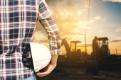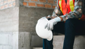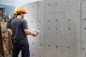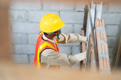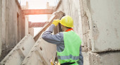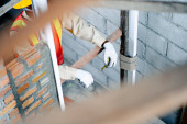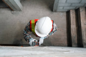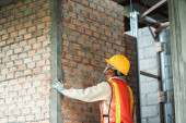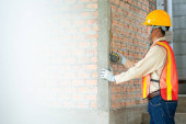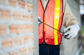 Robotnik budowlany przy użyciu laserowego narzędzia poziomującego do pomiaru