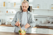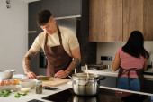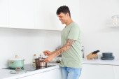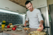 Przystojny młody mężczyzna uśmiecha się siekając świeże warzywa w jasnej i zachęcającej kuchni.