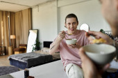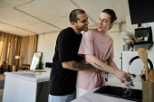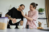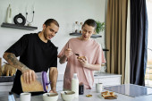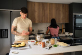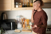Zdjęcie "Przystojny młody mężczyzna uśmiecha się siekając świeże warzywa w jasnej i zachęcającej kuchni." może być wykorzystywane do celów osobistych i komercyjnych zgodnie z warunkami zakupionej licencji Royalty-free. Obraz jest dostępny do pobrania w jakości wysokiej rozdzielczości do 5760x3840.