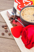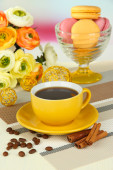 Młynek do kawy, filiżanka kawy, babeczki i piwonia kwiat