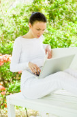 zrelaksowany piękna kobieta za pomocą laptopa siedząc na ławce w s