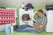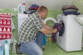 mężczyzna klęka na podłodze w kuchni i czyści piec. czyszczenia pracy w domu. człowieka, pomagając jego żona z usługi sprzątania.