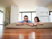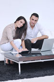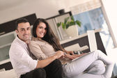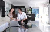 radosna para zrelaksować się i pracować na laptopie w nowoczesnym domu