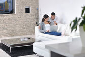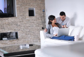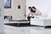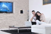 radosna para zrelaksować się i pracować na laptopie w nowoczesnym domu