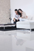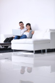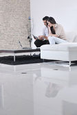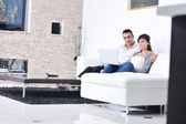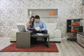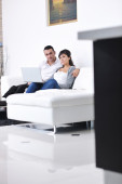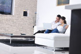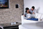 radosna para zrelaksować się i pracować na laptopie w nowoczesnym domu
