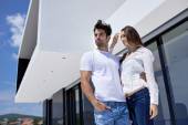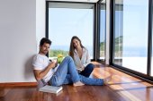radosna para zrelaksować się i pracować na laptopie w nowoczesnym domu