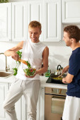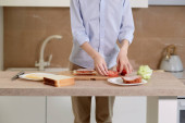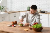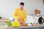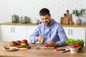 W jasnej kuchni, przystojny młody mężczyzna fachowo kroi świeże warzywa, aby stworzyć pyszną sałatkę.