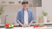 Przystojny młody mężczyzna trzyma filiżankę kawy, zrelaksowany w swojej jasnej i współczesnej przestrzeni kuchennej.