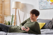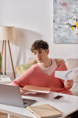 Zdjęcie "Młody mężczyzna z kręconymi włosami pracuje z domu w stylowym mieszkaniu popijając kawę i dzwoniąc." może być wykorzystywane do celów osobistych i komercyjnych zgodnie z warunkami zakupionej licencji Royalty-free. Obraz jest dostępny do pobrania w jakości wysokiej rozdzielczości do 5760x3840.