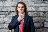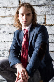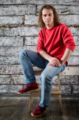 Młody człowiek w skórzanej kurtce siedzi na drabinie żelaza