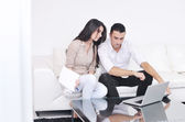 radosna para zrelaksować się i pracować na laptopie w nowoczesnym domu