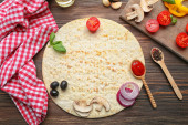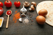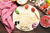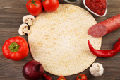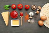 składniki do gotowania pizza na drewnianym stole, widok z góry
