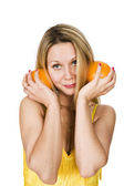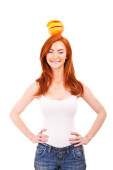 Zdrowa młoda kobieta z orange na głowie na białym tle