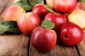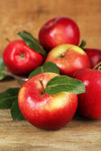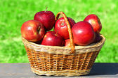 czerwone jabłko w wiklinowym koszu na drewnianym stole na tło zamazane pole