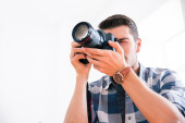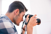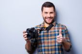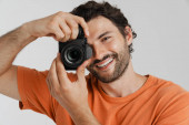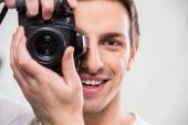 szczęśliwy człowiek siedział przy stole z aparatu fotograficznego