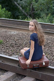 Girl with a suitcase standing on the rails