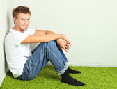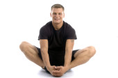 na białym tle portret przystojny młodzieniec noszenie t-shirt czarny siedzi na piłkę fioletowy fitness z ręcznikiem na ramionach i trzymając butelkę wody po ciężkich treningów,