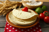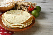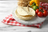 stos domowe pszennej mąki tortilli i warzyw na talerzu, na tle drewniany stół