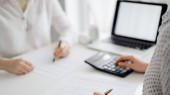Kobieta księgowa liczenia i dyskusji podatków z klientem lub kolegą podczas korzystania z kalkulatora i laptopa komputera. Zespół audytu przedsiębiorstw.