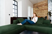 Zdjęcie "Młody mężczyzna w luźnym stroju siedzi wygodnie na kanapie, pracując na laptopie w jasnej przestrzeni." może być wykorzystywane do celów osobistych i komercyjnych zgodnie z warunkami zakupionej licencji Royalty-free. Obraz jest dostępny do pobrania w jakości wysokiej rozdzielczości do 5760x3840.