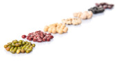 podbite oko grochu, fasoli mung, fasola adzuki, soi, czarną fasolą i czerwona fasola na białym tle