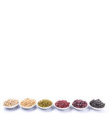 podbite oko groch, fasola mung, fasola adzuki, ciecierzycy, soi, czarną fasolą i czerwona fasola w białej miska na białym tle