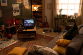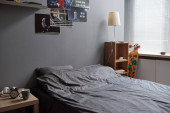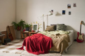 Zdjęcie "Wygodny zestaw badań w przytulnej sypialni retro wyposażony w dobrze zorganizowane biurko z różnymi przedmiotami i plakatami na ścianie, zapewniając inspirację i funkcjonalność do studiowania środowiska" może być wykorzystywane do celów osobistych i komercyjnych zgodnie z warunkami zakupionej licencji Royalty-free. Obraz jest dostępny do pobrania w jakości wysokiej rozdzielczości do 5760x3840.