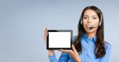 Businesswoman showing blank tablet pc, on grey, with copyspace