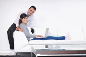 radosna para zrelaksować się i pracować na laptopie w nowoczesnym domu
