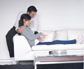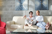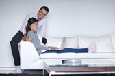 radosna para zrelaksować się i pracować na laptopie w nowoczesnym domu