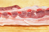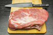 surowy wieprzowina i nóż na drewnianą deską do krojenia.
