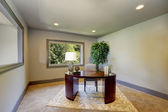 niebieski pokój z dwoma fotelami, białe szafki i zasłony.