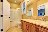 niebieska łazienka z dużą wanną i umywalka podwójna szafka