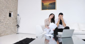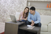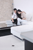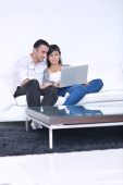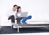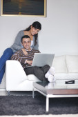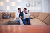 radosna para zrelaksować się i pracować na laptopie w nowoczesnym domu