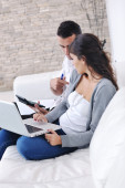 radosna para zrelaksować się i pracować na laptopie w nowoczesnym domu