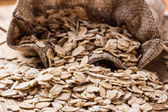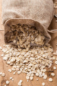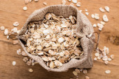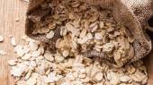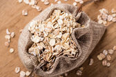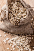 owsiane płatki zbożowe w juta worek na drewnianym stole.