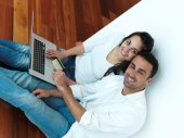 radosna para zrelaksować się i pracować na laptopie w nowoczesnym domu