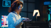 Zdjęcie "Kobieta zajmująca się debugowaniem oprogramowania pomogła współpracowniczka w teledyskach, sprawdzając błędy w liniach kodu. Programista pracujący na podstawie błędów kodowania domowego, wspomagany przez kolegę w telekonferencji, kamera B" może być wykorzystywane do celów osobistych i komercyjnych zgodnie z warunkami zakupionej licencji Royalty-free. Obraz jest dostępny do pobrania w jakości wysokiej rozdzielczości do 5760x3840.