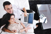 radosna para zrelaksować się i pracować na laptopie w nowoczesnym domu