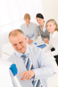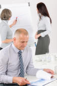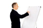 biznesmen dojrzały pisania w pustą tablicę typu flip chart