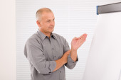 biznesmen dojrzały, wskazując na pustą tablicę typu flip chart
